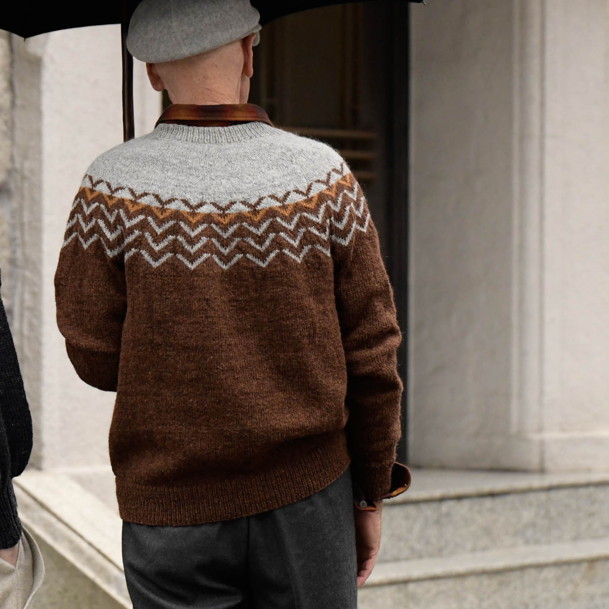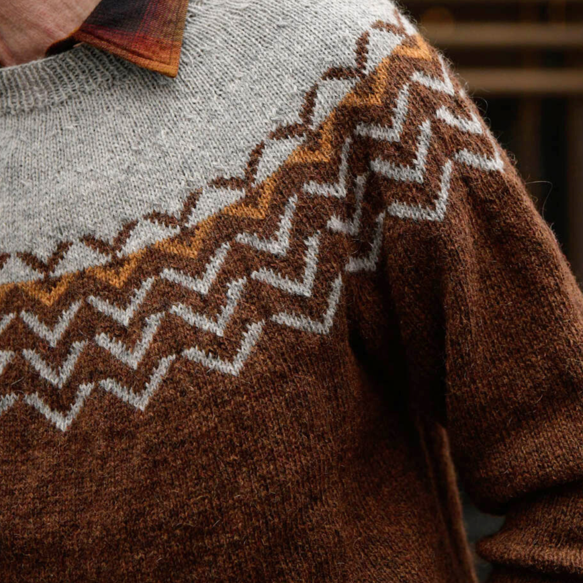 どことなくクラシカルな模様ながら、1列だけ色を変えるなど、今どきなアクセントがおしゃれなデザイン。だんだんと目を減らしながら、模様も小さくなっていく、丸ヨークならではのリズミカルな編み込み模様です。